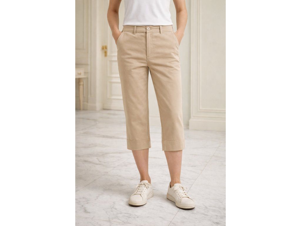 Tyto dámské 3/4 kalhoty v nadčasové béžové barvě jsou ideální volbou pro ženy, které hledají kombinaci pohodlí, praktičnosti a elegantního vzhledu. Díky vyššímu pasu kalhoty krásně sedí na postavě a lichotí siluetě, zatímco rovný střih a délka pod kolena zajišťují komfort při nošení po celý den.
