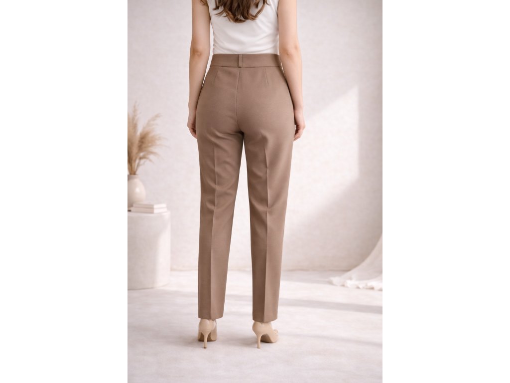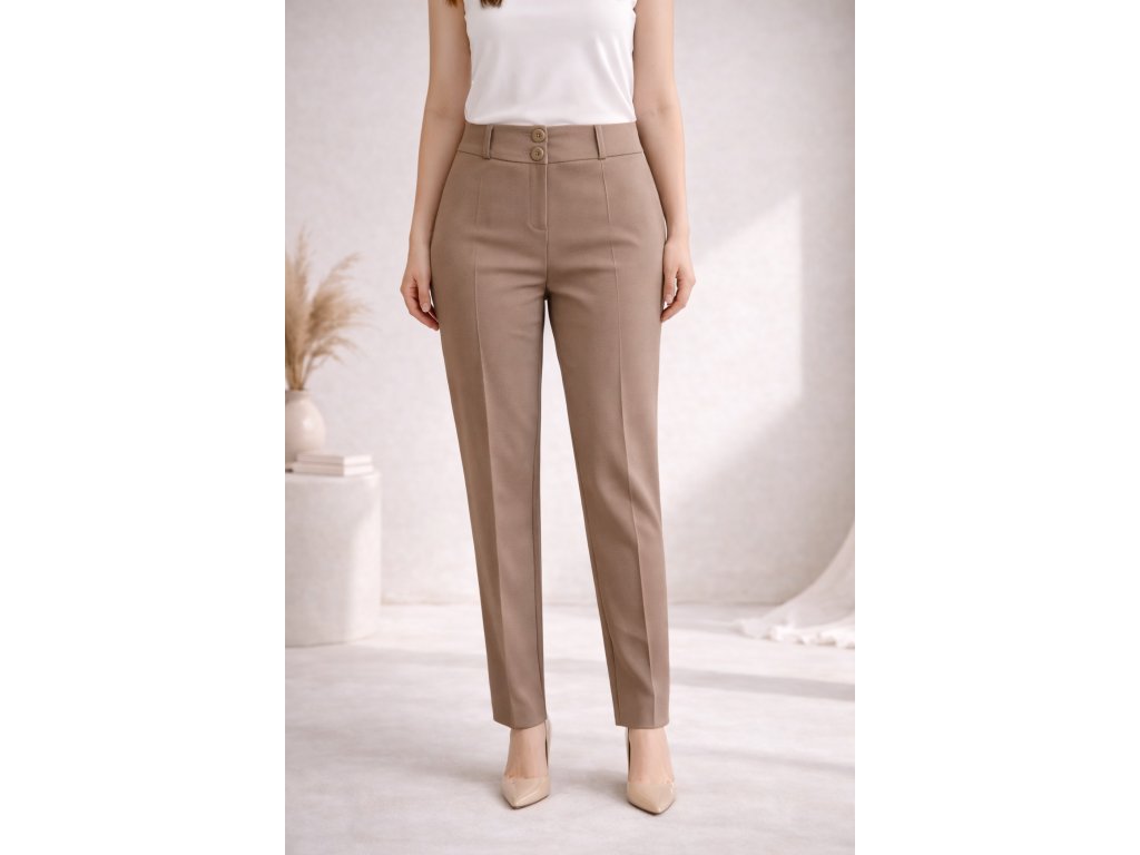 Elegantní dámské béžové společenské kalhoty s klasickým střihem. Zapínání na dva knoflíky, bez kapes – ideální volba pro formální, pracovní i volnočasové příležitosti.