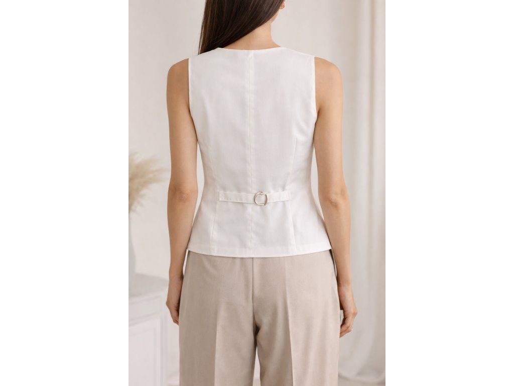 Díky hladké a lehce splývavé tkanině působí vesta elegantně a zároveň komfortně při nošení. Zadní část je doplněna nastavitelným páskem s kovovou sponou, který umožňuje přizpůsobení podle postavy a zajišťuje lepší tvarování.