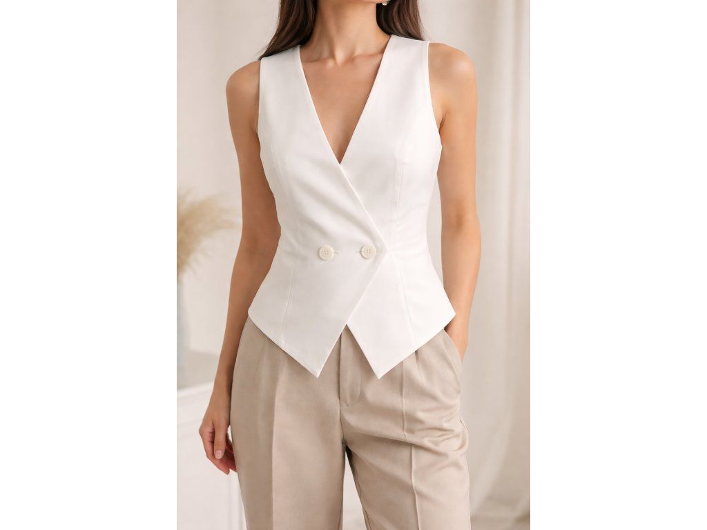 Elegantní dámská vesta s kříženým zapínáním a asymetrickým zakončením. Nadčasový střih, který se snadno kombinuje a hodí se pro každodenní i elegantní outfit.