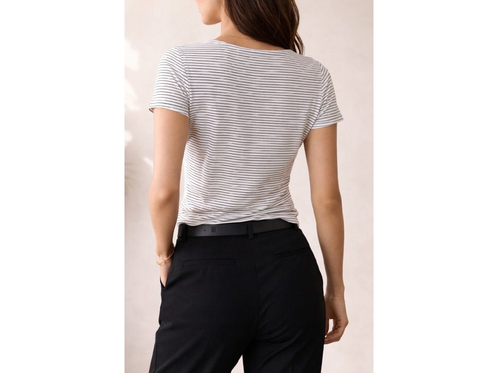 Véčkový výstřih dodává tričku elegantní a lehce ženský nádech, zatímco krátké rukávy zajišťují pohodlí při celodenním nošení. Jemný proužkovaný vzor působí decentně a zároveň dodává outfitu zajímavý detail.