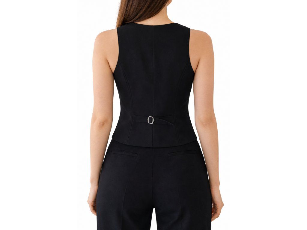 Stylová krátká vesta v černé barvě s klasickým zapínáním na knoflíky. Elegantní střih inspirovaný pánským tailoringem, ideální pro vrstvení i samostatné nošení.