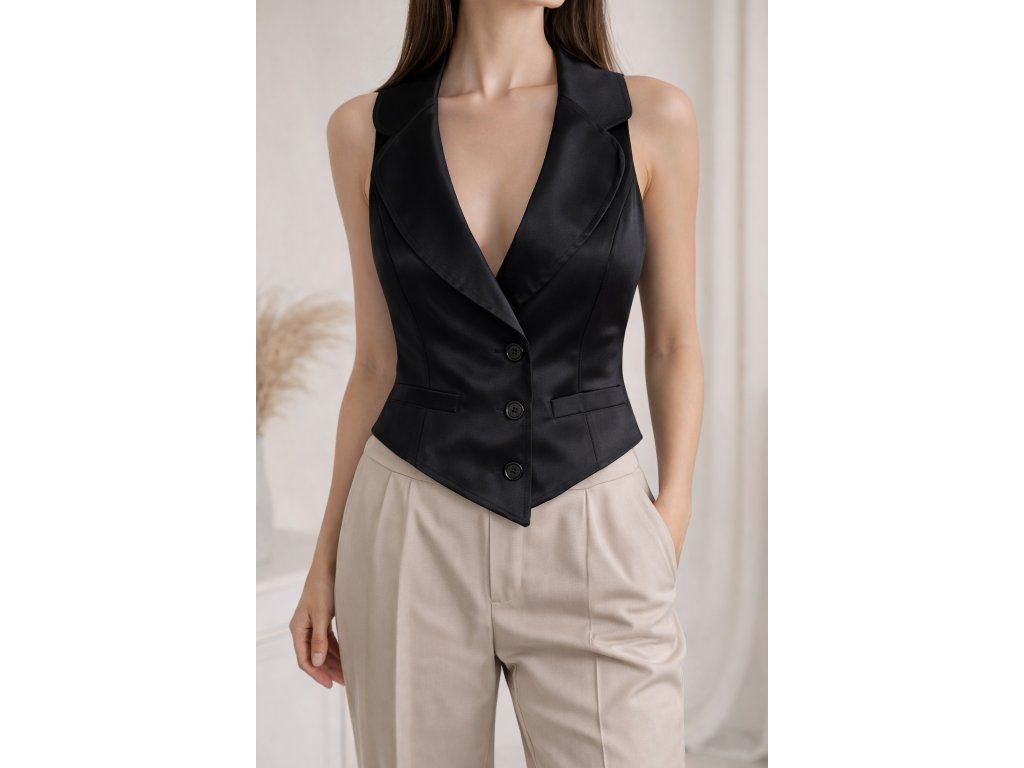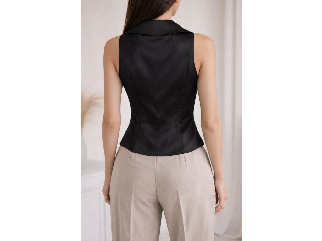 Dámská elegantní vesta s límečkem, zapínáním na knoflíky a jemně projmutým střihem. Nadčasový kousek vhodný pro formální i moderní outfity.