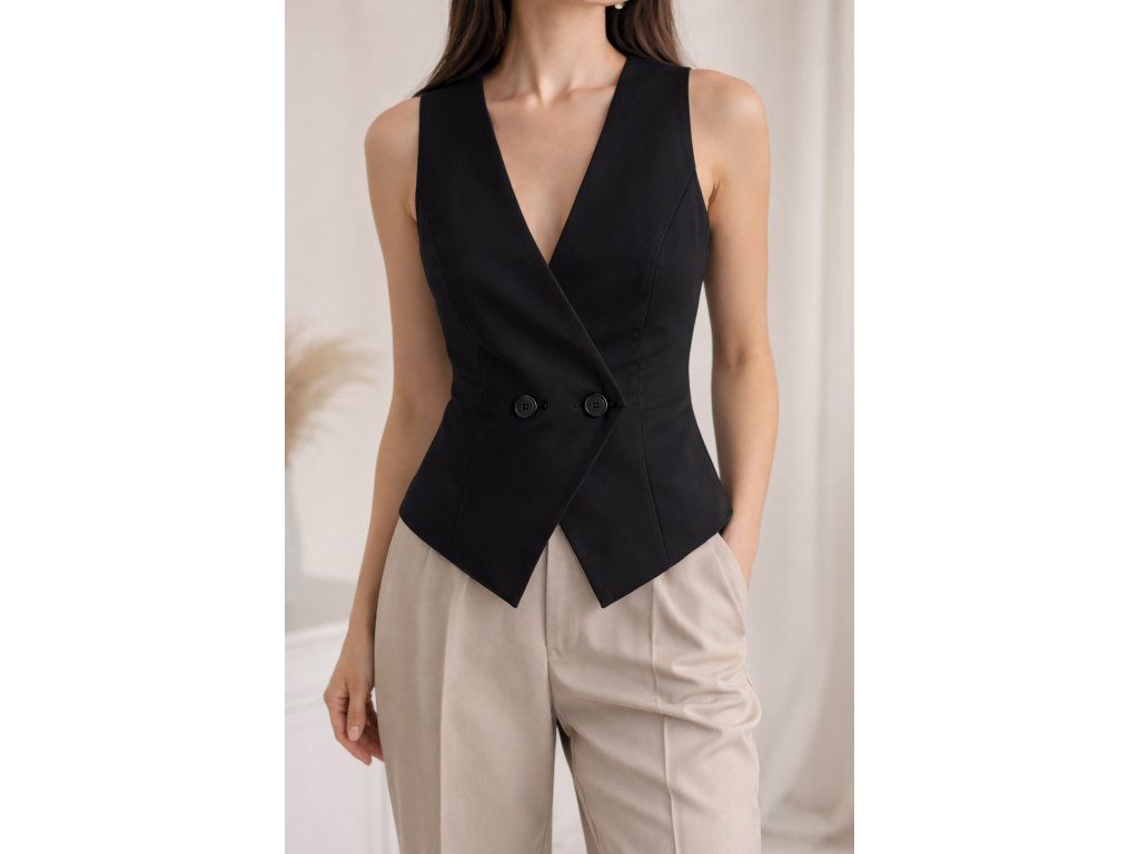 Elegantní dámská vesta s kříženým zapínáním a asymetrickým zakončením. Nadčasový střih, který se snadno kombinuje a hodí se pro každodenní i elegantní outfit.