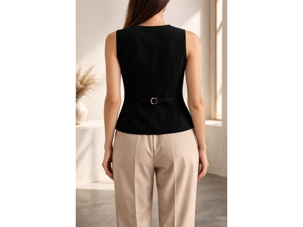 Díky hladké a lehce splývavé tkanině působí vesta elegantně a zároveň komfortně při nošení. Zadní část je doplněna nastavitelným páskem s kovovou sponou, který umožňuje přizpůsobení podle postavy a zajišťuje lepší tvarování.