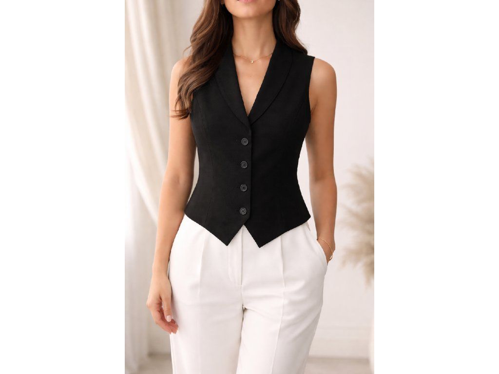 Elegantní dámská společenská vesta se zapínáním na čtyři knoflíky. Stylový kousek, který podtrhne ženskou siluetu a dodá outfitu sofistikovaný vzhled.