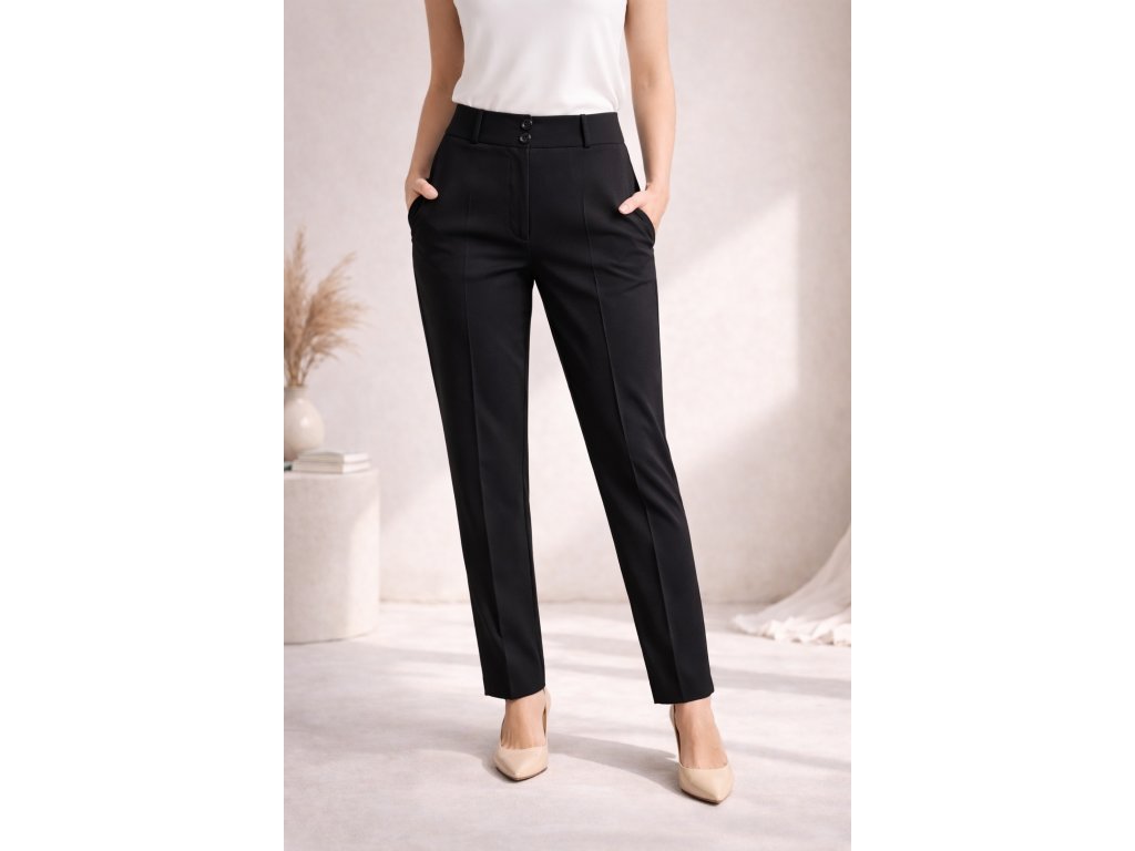 Elegantní dámské černé společenské kalhoty s klasickým střihem. Zapínání na dva knoflíky, bez kapes – ideální volba pro formální, pracovní i volnočasové příležitosti.