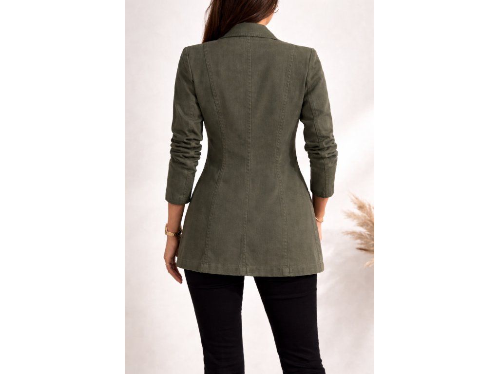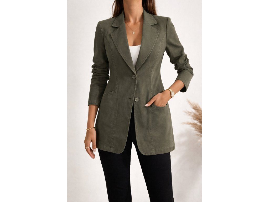Dámské sako v olivově zelené barvě s klasickým límcem a knoflíky. Elegantní kousek pro moderní a nadčasový outfit.