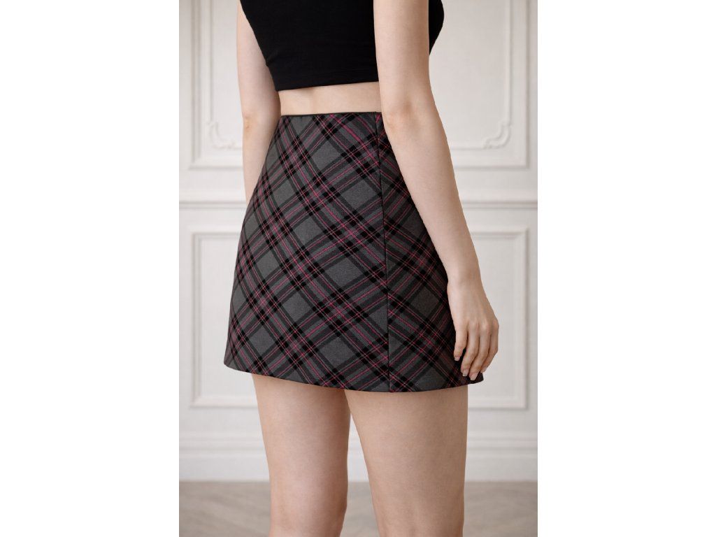 Kombinace černé, šedé a jemných červených linií vytváří nadčasový vzor inspirovaný klasickým tartanem, který nikdy nevyjde z módy. Sukně je vyrobena z pevnějšího materiálu, díky kterému si drží svůj tvar a působí upraveně po celý den.
