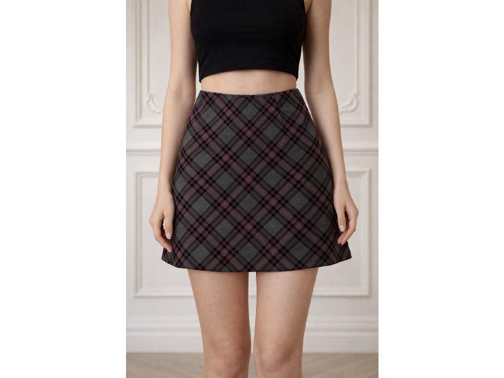 Stylová károvaná sukně s vysokým pasem, která kombinuje eleganci s lehce rebelujícím nádechem. Perfektní kousek pro moderní, výrazný outfit.