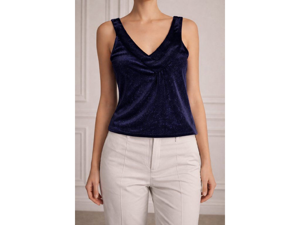 Tento dámský top bez rukávů v hlubokém tmavě modrém odstínu zaujme svým jemným třpytivým efektem, který dodává outfitu luxusní a elegantní vzhled. Přiléhavý střih krásně kopíruje postavu a podtrhuje ženskou siluetu.