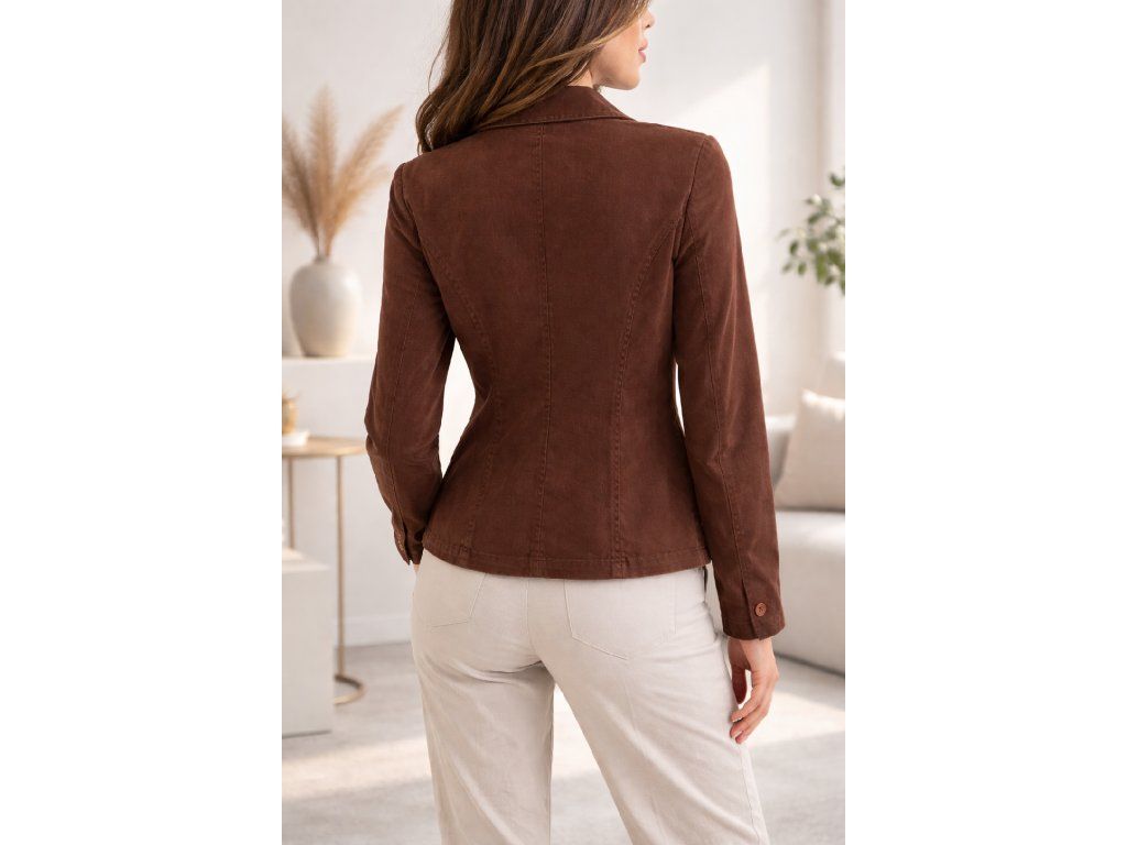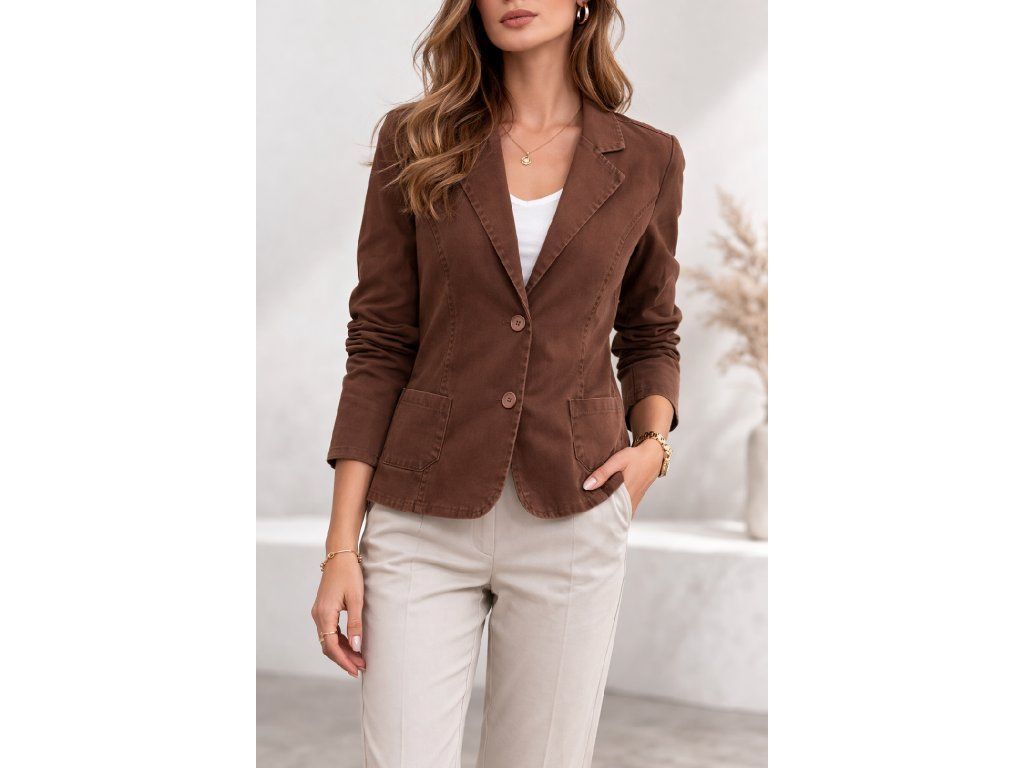 Toto dámské sako v teplém hnědém odstínu je ideální volbou pro ženy, které hledají nadčasový a snadno kombinovatelný kousek do svého šatníku. Díky lehce projmutému střihu krásně zvýrazňuje siluetu a působí elegantně, ale zároveň uvolněně.