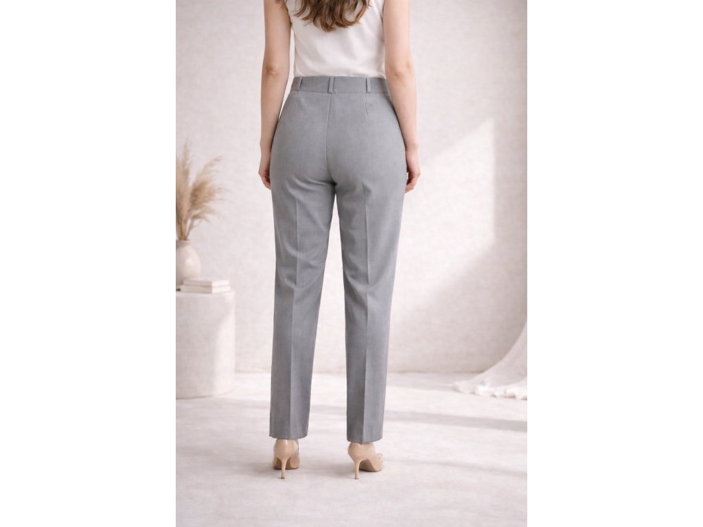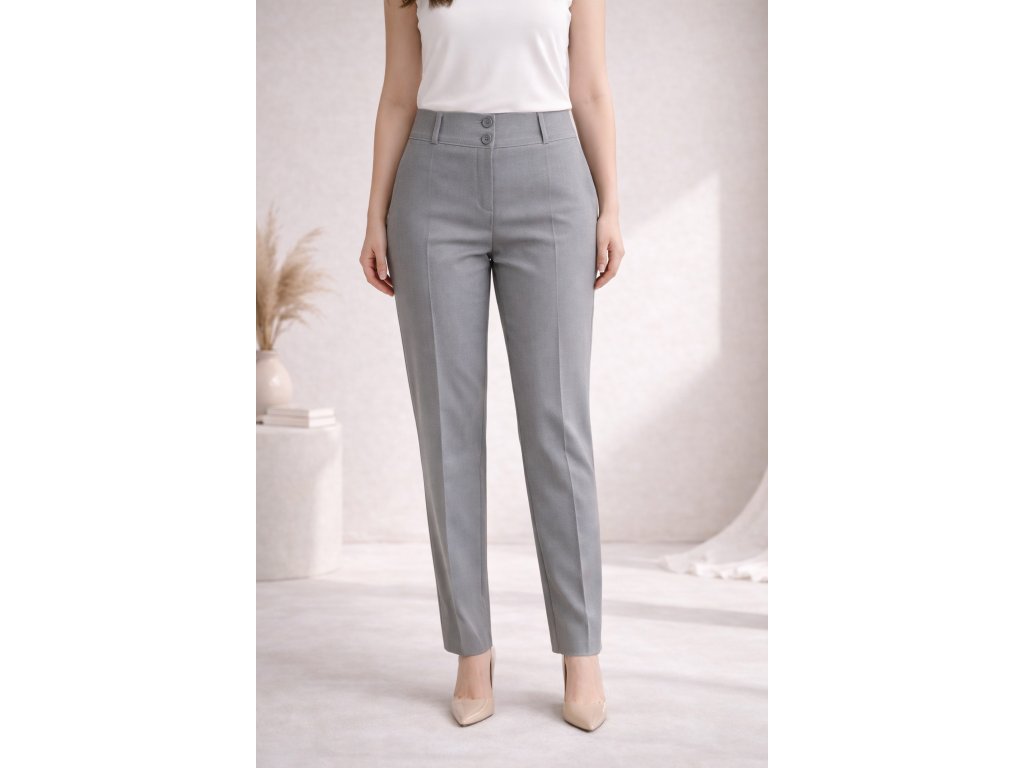 Elegantní dámské světle šedé společenské kalhoty s klasickým střihem. Zapínání na dva knoflíky, bez kapes – ideální volba pro formální, pracovní i volnočasové příležitosti.