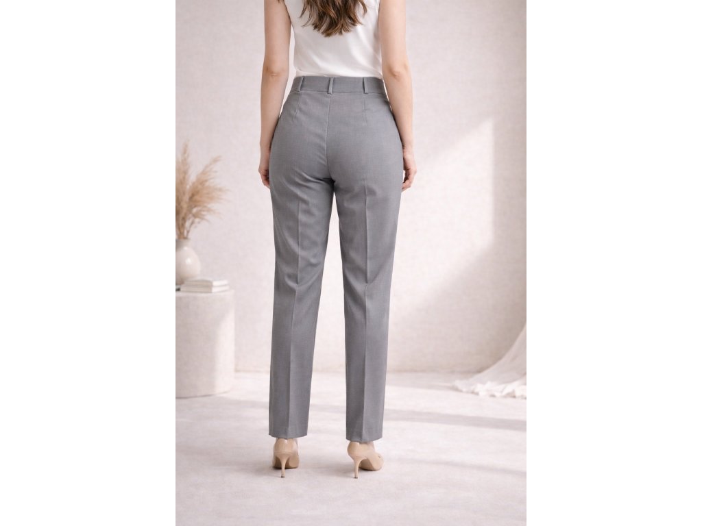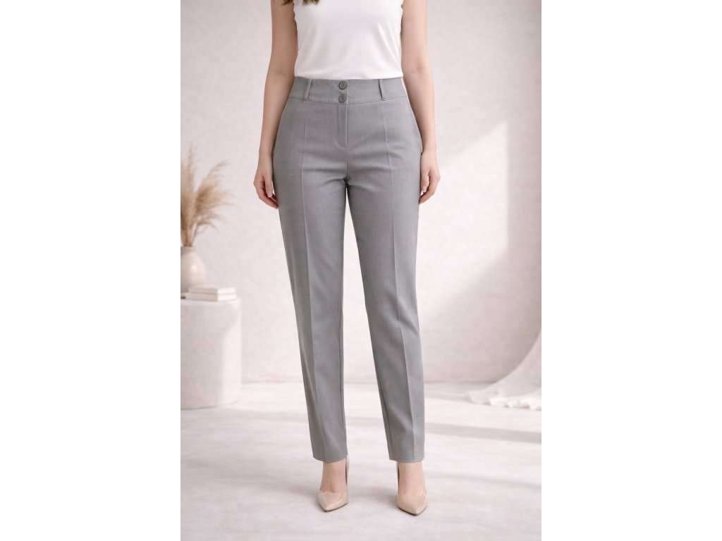Elegantní dámské světle šedé společenské kalhoty s mramorově šedými knoflíky a s klasickým střihem. Zapínání na dva knoflíky, bez kapes – ideální volba pro formální, pracovní i volnočasové příležitosti.