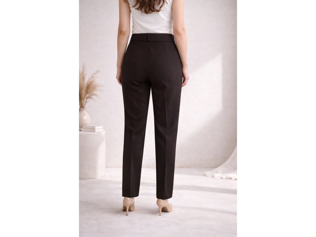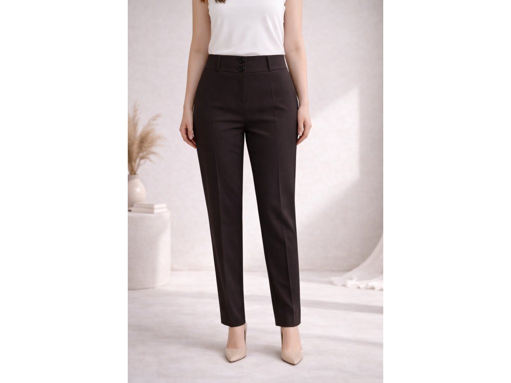 Elegantní dámské tmavě hnědé společenské kalhoty s klasickým střihem. Zapínání na dva knoflíky, bez kapes – ideální volba pro formální, pracovní i volnočasové příležitosti.