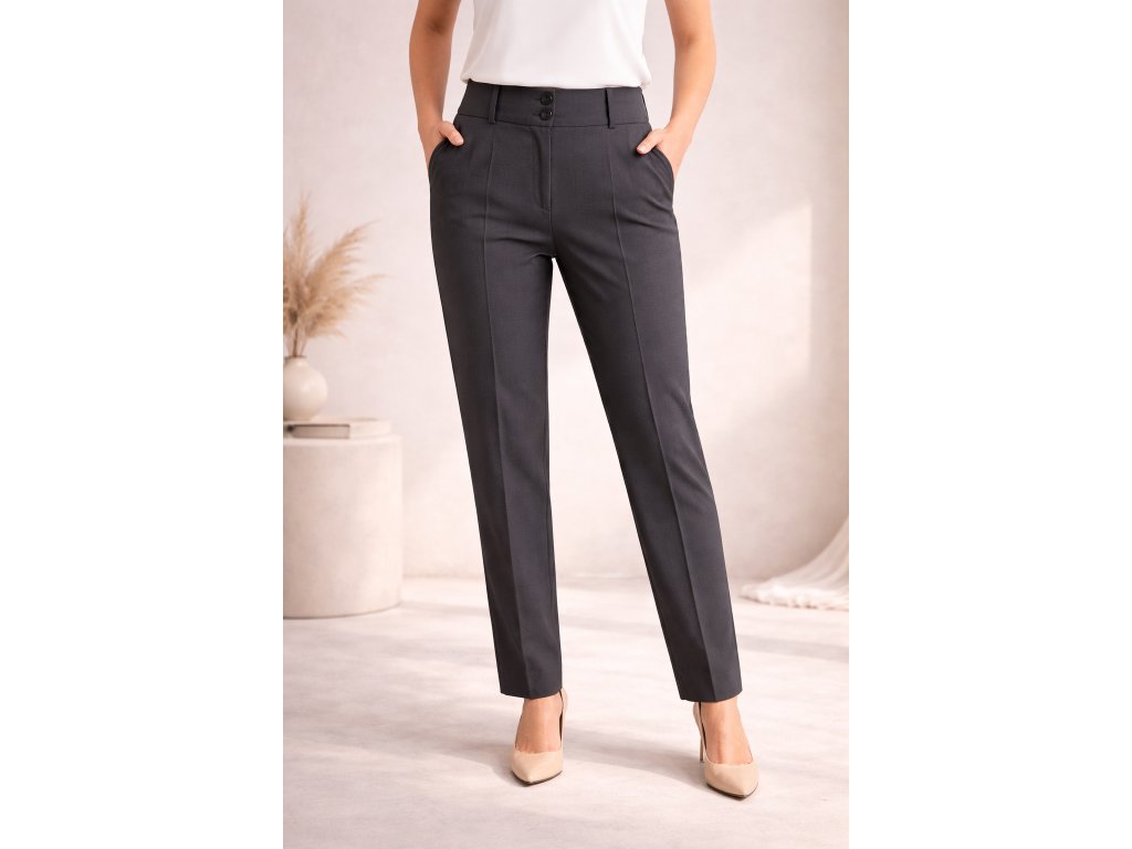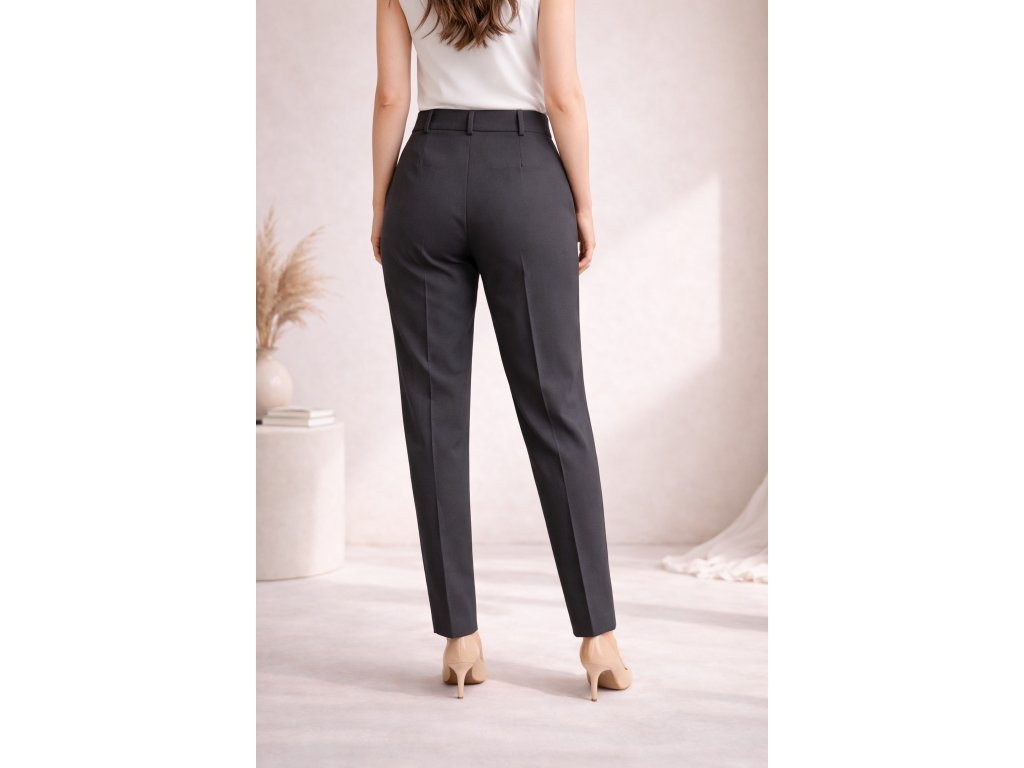 Elegantní dámské tmavě šedé společenské kalhoty s klasickým střihem. Zapínání na dva knoflíky, bez kapes – ideální volba pro formální, pracovní i volnočasové příležitosti.